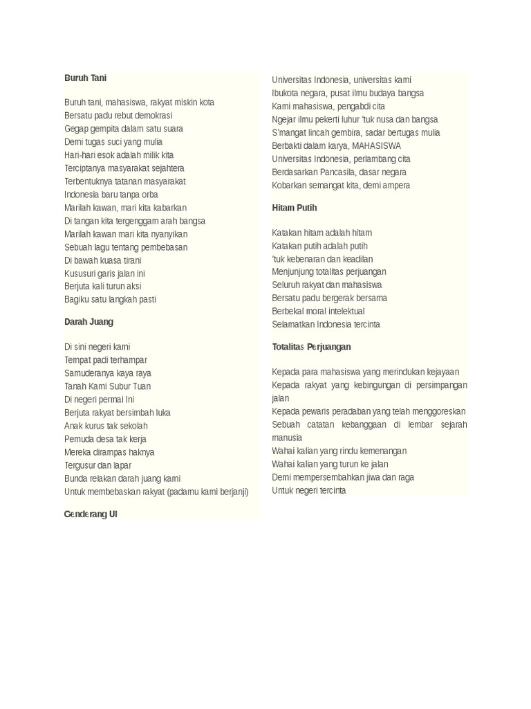 Lirik buruh tani oleh buruh tani. Download lagu buruh tani slow gitar mp3 gratis. Kau bertanya padaku kapan aku akan kembali lagi. Lagu yang sering dinyanyikan saat demo mahasiswa ini memiliki lirik yang sangat membakar semangat. verse 1 am buruh tani mahasiswa rakyat miskin kota dm am bersatu padu rebut demokrasi dm am gegap gempita dalam satu suara g am demi tugas suci yg mulia.